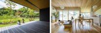 (右) 圧倒的な広さを感じる梁のない勾配天井。大開口の窓からたっぷりの緑と光が降り注ぎます