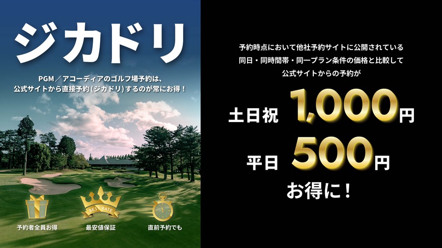※3【価格比較の対象について】現在インターネットに一般公開されている同条件(プレー日・時間・人数・プラン内容)のプランが対象です。キャンペーン、クーポン、無料券・優待券、メンバー(会員)料金、および割増料金やキャディーフィなどの追加料金は比較対象外となります。また、公式サイトのプラン数には限りがあります。