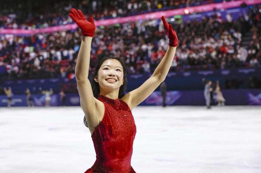 エキシビションの演技を終え、歓声に応える中井亜美=ミラノ(共同)