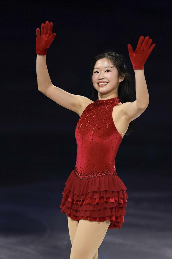 エキシビションで演技を終え、歓声に応える中井亜美=ミラノ(共同)