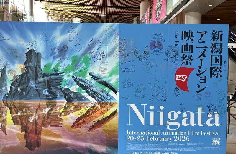 新潟日報メディアシップの1階に置かれた大型看板。来場したゲストが書いたサインを見るのも楽しい(五味さん撮影)