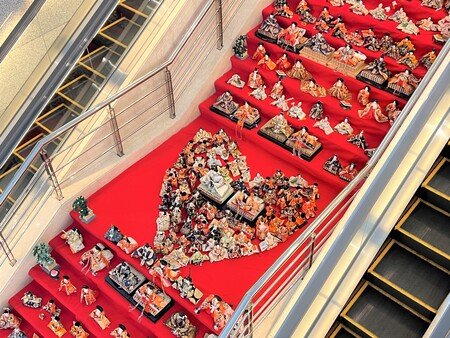 当ホテル1階から2階へと続く36段の大階段には、約590体の雛人形がずらりと並びます。下から見上げても、上から見下ろしても視界いっぱいに広がる光景は圧巻で、立体的な構成が生み出す奥行きと迫力が来場者を迎えます。階段下段には約100年前の貴重な人形も展示し、時代を超えて受け継がれてきた歴史と想いを感じていただけます。今年は階段中央に人形で描いた「ハート」の演出が新たに登場し、エスカレーターで上階へ進み見下ろしたときに初めて完成する仕掛けをご用意しました。「良縁」や「しあわせ」への願いを込めた演出には、地域の皆さまへの感謝と、展示を通じて想いを紡いでいきたいという気持ちを重ねています。