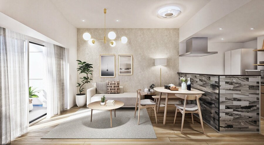 左:「シーズナルリビングバルコニー」イメージ(『イニシアラウンジ三田』コンセプトルーム)/右:A-Atypeリビング・ダイニング完成予想CG