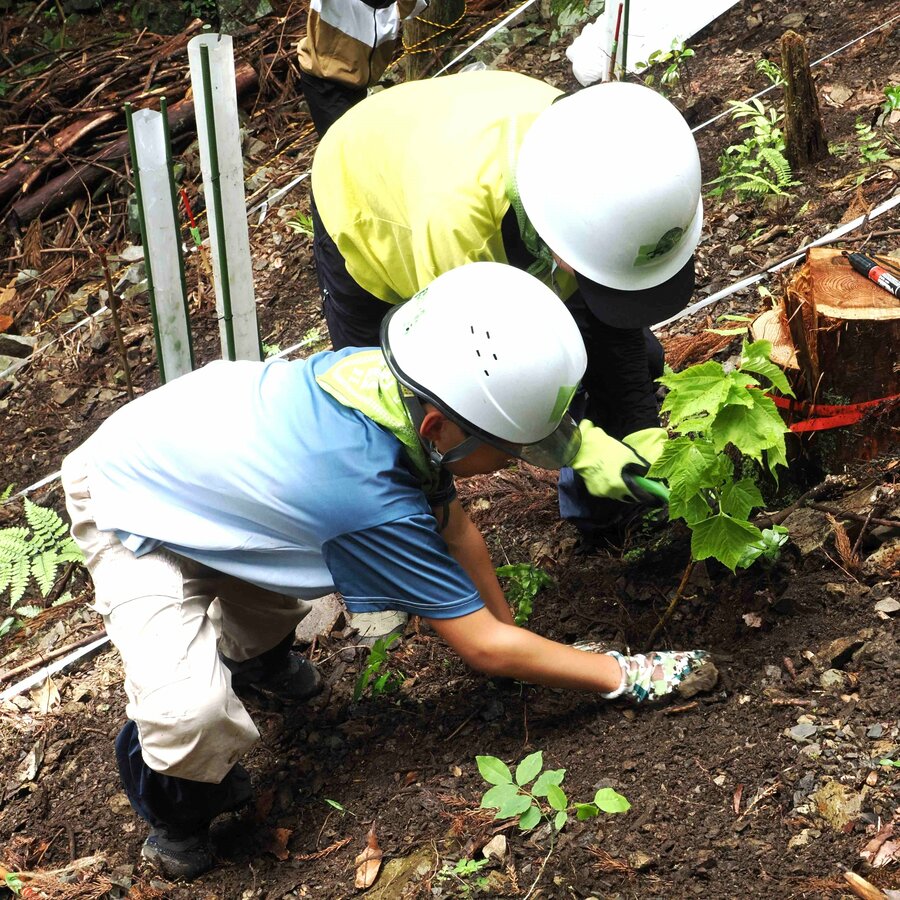 ・新たな苗を植樹できるように土地を整理する作業「地拵え(じごしらえ)」を体験し、木を育てる過程で最初に行う重要な作業を学びます。