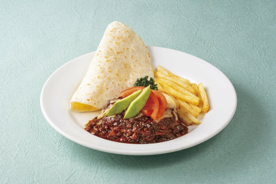 野菜や豆を甘酸っぱくスパイシーに仕上げたメキシカンソースのハンバーグをトルティーヤに挟んで食べるスタイルのタコス風ハンバーグです。