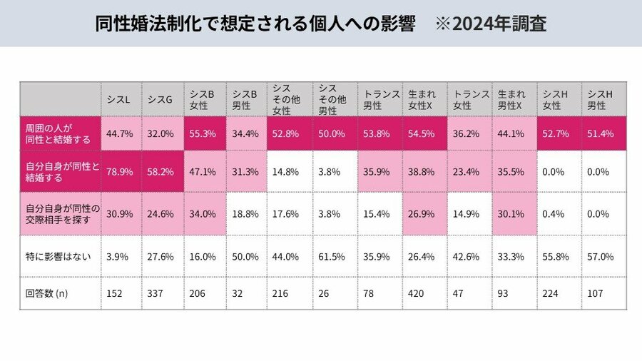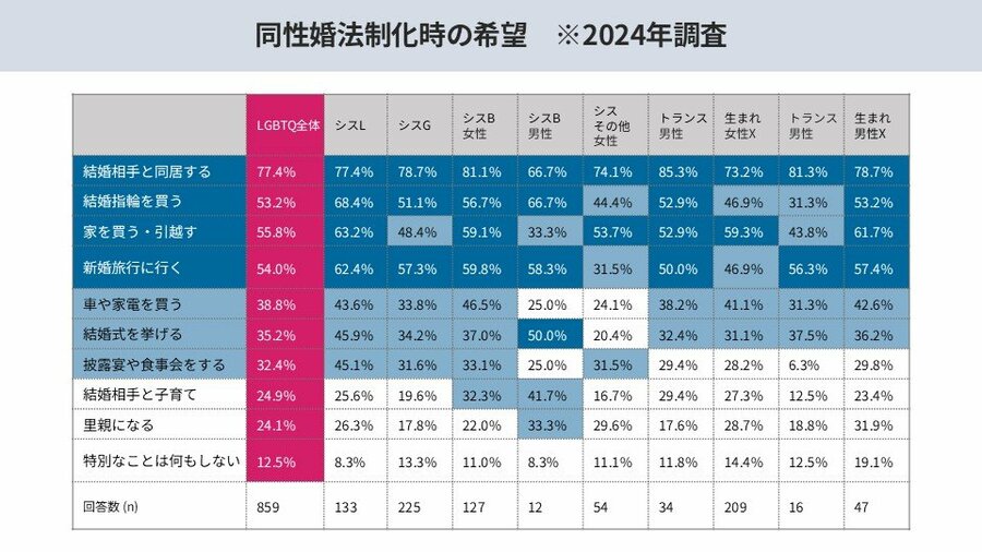 同性婚が実現した場合、「同性と結婚する(43.0%)」「同性の交際相手を探す(25.2%)」といった回答が上位に並び、法制化が当事者の生活に大きな影響をもたらすことが明らかに。
