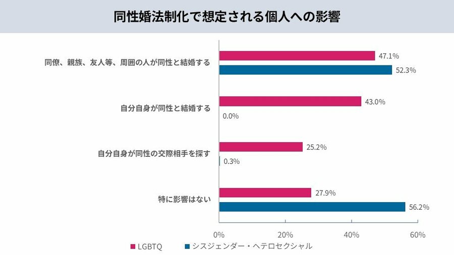 一方で、非当事者層では、法制化したとしても「特に影響がない(56.2%)」という回答が過半数を占めました。「周囲の人が同性と結婚する(52.3%)」という認識はあるものの、法制化を自身の生活において具体的にイメージすることの難しさが伺えます。