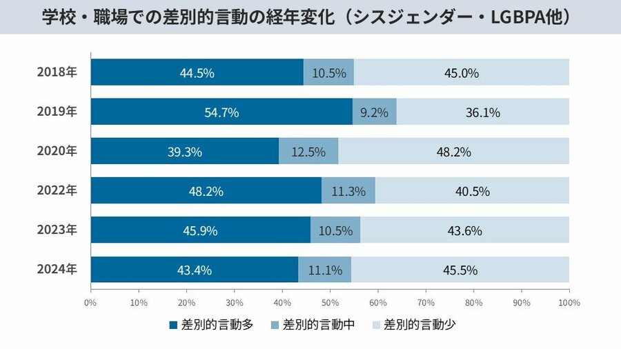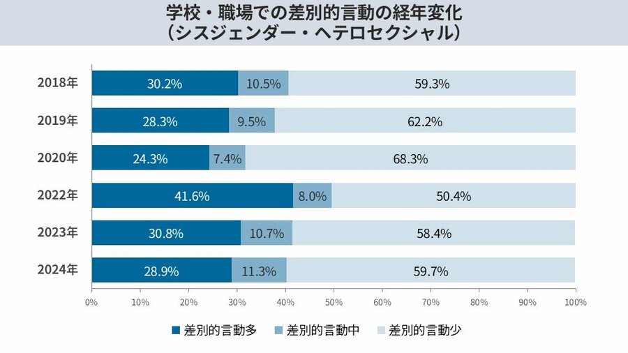 学校や職場での性的マイノリティを取り巻く差別的言動の発生状況について、2018年から2020年にかけては減少傾向にありましたが、2022年から2024年においては、シスジェンダーかつヘテロセクシュアル(以下、非当事者層)を除き、改善が見られないことが明らかになりました。