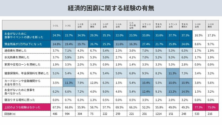 経済的困窮に起因する生活上の困難についても明らかになりました。「金銭的な理由で食事やイベントの誘いを断った」「預金残高が1万円以下になった」などの経験を持つ割合は、非当事者層と比較して当事者層で高い結果となっています。特にトランス女性の36.7%が年収200万円未満で、トランスジェンダーの11.6%は「お金がなく食事を抜いた経験がある」と回答しており、経済的基盤の脆弱さが見受けられます。(※シスジェンダーのパンセクシュアル男性、アセクシュアル男性、その他男性については回答数が僅少なため、統計的分析の対象外としています。)