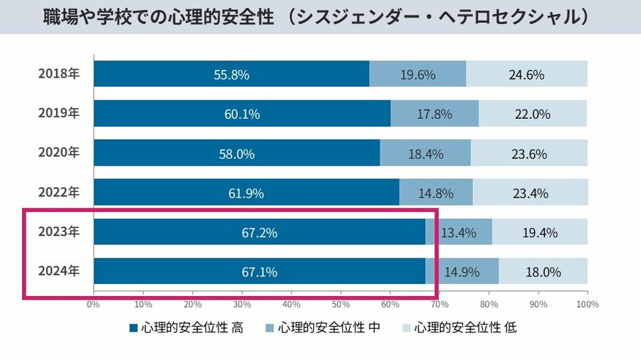 当事者層における心理的安全性は、2018年から2022年にかけて低下傾向にありましたが、2023年からは回復の兆しを見せています。また、2024年時点で心理的安全性が高いと回答した当事者は53.2%と過去最高を記録したものの、非当事者層の67.1%と比較すると、心理的安全性の確保には課題が残っていることがわかります。さらに、社会的な逆風や理解不足が職場環境においても当事者を追い詰める要因となっている懸念があります。