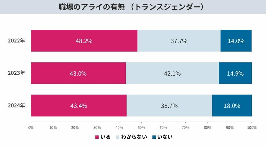 職場におけるアライ(⽀援者)の有無について、2020年から2022年にかけて、当事者層において「アライがいる」の回答は2020年では42.3%のところ2024年では37.5%と減少傾向にあります。トランスジェンダー層においても、2020年は48.2%が2024年は43.3%と減少しています。