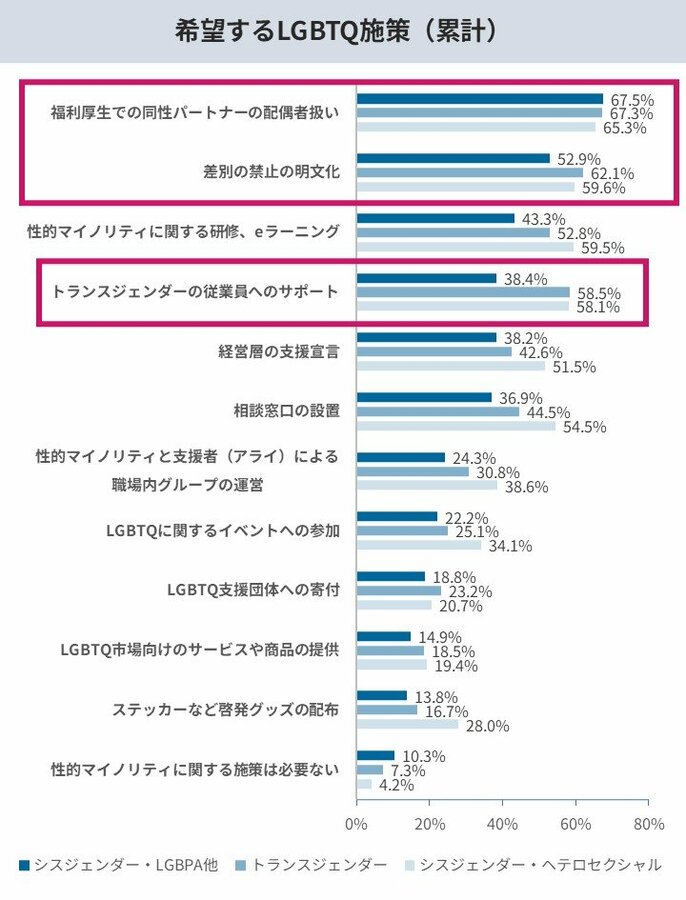 また当事者が求める施策と、実際に企業が導入している施策の間にもギャップが見られます。当事者の希望では「福利厚生における同性パートナーの配偶者扱い」「差別の禁止の明文化」「トランスジェンダーの従業員へのサポート」などが上位に挙がっていますが、これらの実施率は依然として低く、当事者のニーズに企業の対応が追いついていない状況です。