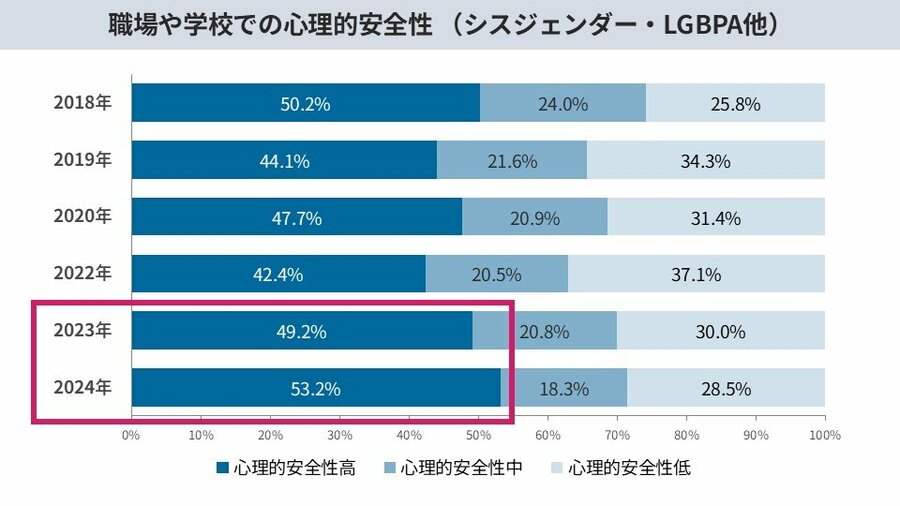 4)LGBTQの53.2%が心理的安全性が高いと回答し過去最高。一方で、トランスジェンダーは低下傾向。