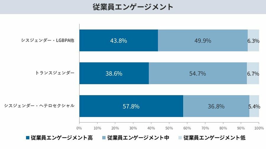 業員エンゲージメントにおいては、当事者層は非当事者層と比較して低い水準に留まっていることが判明しました。「エンゲージメントが高い」と回答した割合は、シスジェンダーかつヘテロセクシュアル(非当事者)層の57.8%に対し、シスジェンダーのLGB他層で43.8%、トランスジェンダー層では38.6%にまで低下しています。