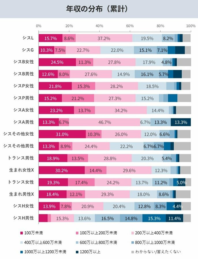 トランス女性の約4割弱が年収200万円未満であり、トランスジェンダーの約12%が「お金がなく食事を抜いた経験がある」と回答。非正規雇用や単身世帯が多いこともあり、物価高などの社会不安の影響を直接的に受けていることが明らかに。