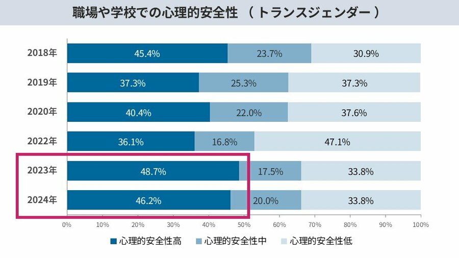 LGBTQに関する施策は増加しているが、差別的発言の増加によりLGBTQ当事者層(以下、当事者層)の心理的安全性は低い状況。トランスジェンダーの心理的安全性は2023年の48.7%から46.2%へと2.5ポイント減少。出生時の性別が女性のXジェンダーにおいては40.9%と最も低い結果に。