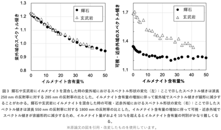 ・ 幅広い混合比で得られたスペクトルデータの解析により、イルメナイト含有量を正確に推定するための指標を確立