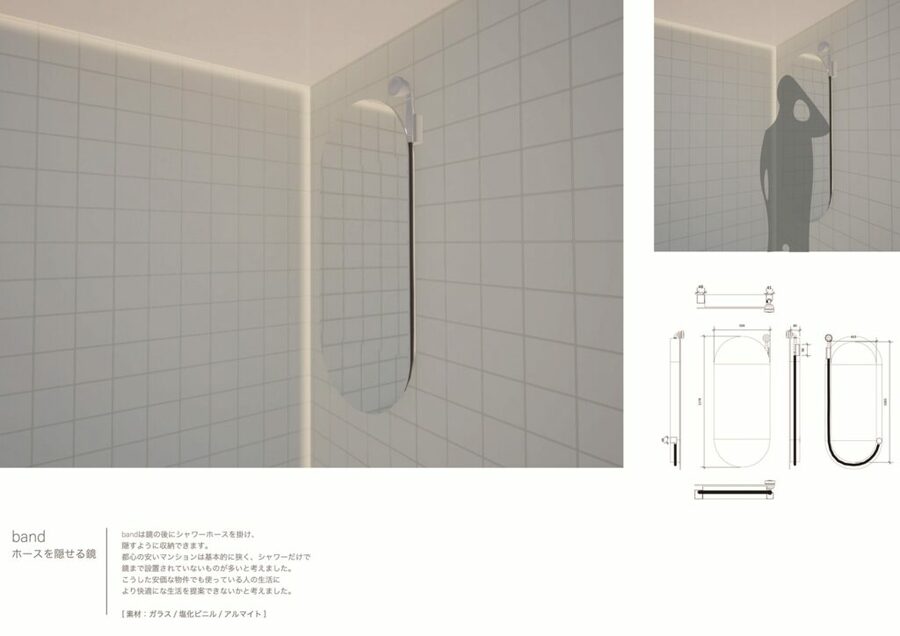 関さんの作品「band」は、鏡の背後にシャワーホースを掛けて隠し、目立つ濃いグレーのホースを壁面に馴染ませる収納提案。鏡の反射で周囲の環境と調和させ、鏡を見ながら洗えない賃貸のシャワールームの不便さを解消し、同様の住環境にある人の生活改善を目的に制作された。