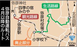 弥彦村が運行している自動運転バス「ミコぴょん号」について、村は4月1日以降のルートを再編する。二つあった生活路線を一つにまとめる一方、昨年12月にスタートした観光路線は継続する。