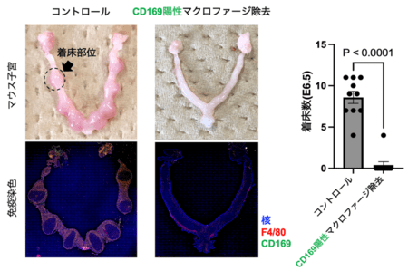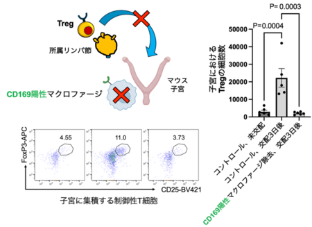・同定したマクロファージはCD169(Siglec-1)(*2)を発現し、着床の際に制御性T細胞(Treg)(*3)を子宮に集める役割を持つことを明らかにしました。