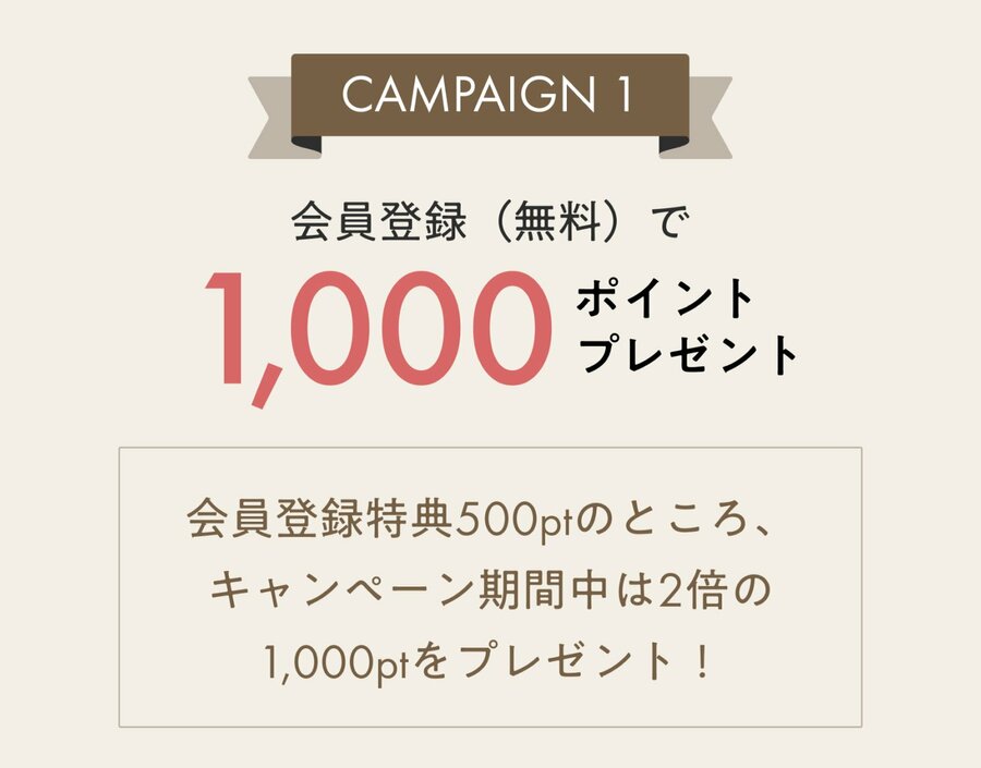 通常500ポイントの会員登録特典を、キャンペーン期間中は2倍の1,000ポイントに増量いたします。