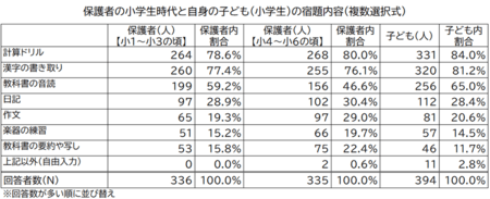 子どもの方が忙しいと回答した人にその理由を自由記述形式で尋ね、内容を分類したところ、最も多かったのは「習い事や学校が忙しい」(28.9%)、「宿題等やることや学ぶことが多い」(28.5%)、「特になし、なんとなく」(21.5%)と続きました。一方、保護者が忙しいと感じている理由の上位に挙がっていた「習い事の頻度」や「宿題にかけた時間」について、同調査内で、現在の小学生と保護者の小学生時代をそれぞれ尋ねたところ、大きな差異は見られませんでした。宿題の内容についても、保護者が小学生の時代と現在の小学生では、いずれも計算ドリルや漢字ドリル、音読などが上位に来ており、差は見られませんでした。