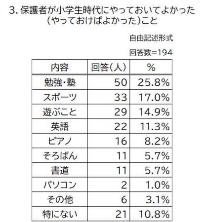 また、保護者が子どもの頃にやっていてよかったこと、またはやっておけばよかったことについて尋ねた質問では、勉強(25.8%)、次いでスポーツ(17.0%)、遊ぶこと(14.9%)と続きました。