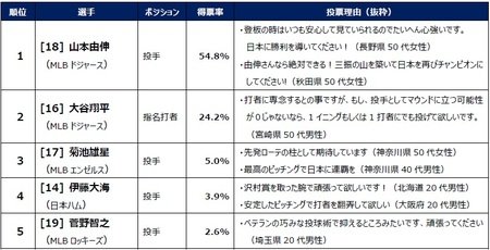2位は大谷選手のロサンゼルス・ドジャースのチームメイトで、昨年のワールドシリーズMVPにも輝いた山本由伸選手、3位は前回大会を直前の故障により欠場したシカゴ・カブスの鈴木誠也選手、4位は昨年セ・リーグMVP受賞の阪神タイガースの佐藤輝明選手、5位は前回大会の優勝に圧巻の脚力で貢献した福岡ソフトバンクホークスの周東佑京選手でした。