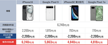 (※2)Google Pixel7aご契約時、ゼロネオ割で端末代を60回分で分割した料金です。