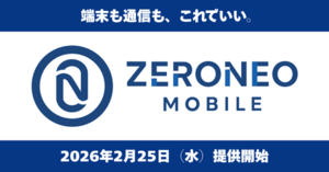 株式会社ALL CONNECT(代表取締役社長:岩井 宏太、本社:福井県福井市)の子会社である株式会社ミラインク(代表取締役:斉藤 鋭一、福井県福井市)は、スマートフォンとSIMをセットで提供する新MVNOサービス「ZERONEO MOBILE(ゼロネオモバイル)」を、2026年2月25日(水)より提供開始いたします。端末代は実質0円(※1)。データ容量無制限(※3)の通信とともに、端末も通信も“これでいい”と思える新しい選択肢を提案します。
