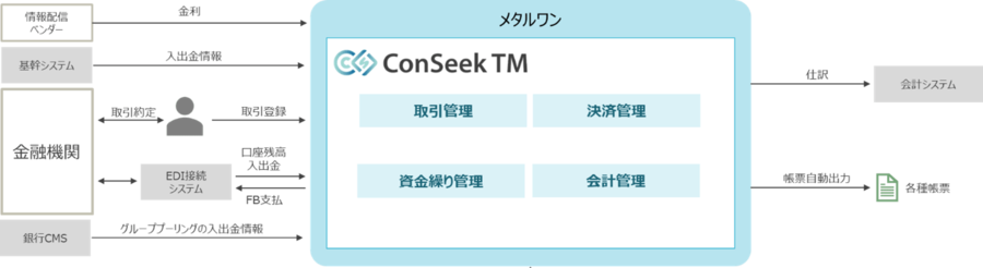 「ConSeek TM」は、取引管理、決済管理、口座残高・資金繰り管理、金融機関接続、会計仕訳など、財務業務を包括的且つ一気通貫で支援する多彩な機能を備えており、「ConSeek TM」を導入することで、財務業務の効率化・自動化とガバナンス強化を実現します。