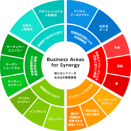 積水ハウスグループでは、2024年2月に「積水ハウス イノベーション&コミュニケーション株式会社」を設立しました。イノベーション人財やグローバル人財の育成に加え、社外パートナーとのオープンイノベーションを通じて、社会に新たな価値を創造し、人々の生活をより豊かに、より幸せにすることを目指しています。事業創出においては、”Business Areas for Synergy(新たなシナジーを生み出す事業領域)”のコンセプトに基づきオープンイノベーションを推進することで、協業先とお互いの事業成長や人財価値の向上に寄与しながら、「住まいと暮らし」に関する様々な社会課題解決を目指します。