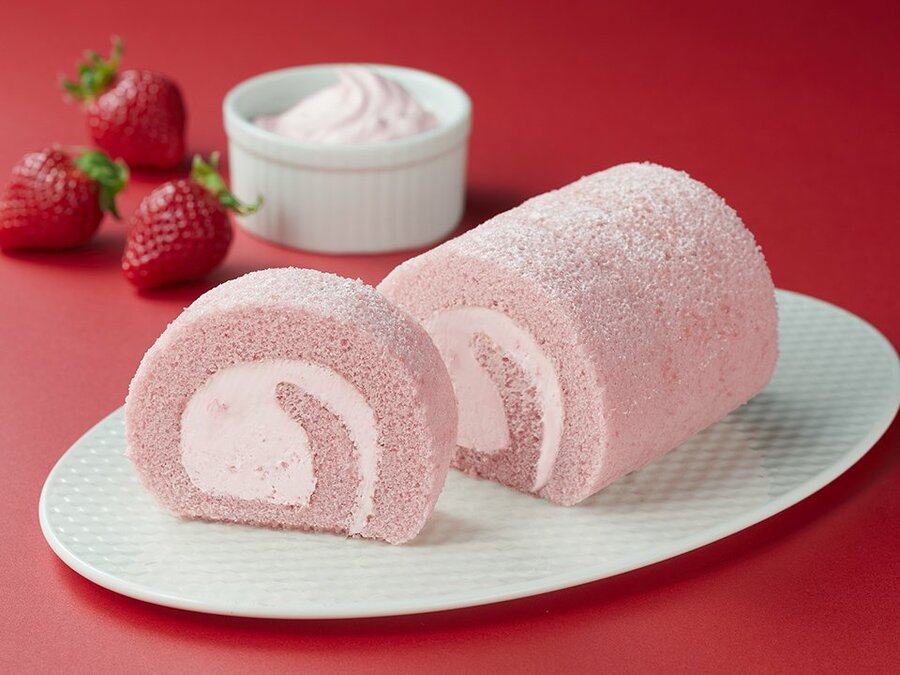 オリジナル苺ソースと自家製カスタードを混ぜ合わせ、ピンク色の生地でやさしくふんわり手巻きしました。