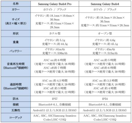 <主な仕様 : 「Samsung Galaxy Buds4 Pro」「Samsung Galaxy Buds4」>
