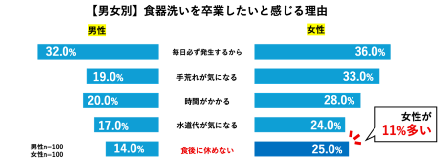 また「食器洗いを卒業したいと感じる理由」について尋ねたところ、「毎日必ず発生するから」(34.0%)が最多となり、次いで「手荒れが気になるから」(26.0%)、「時間がかかりストレスを感じるから」(24.0%)といった声が多く上がりました。なかでも特に女性は、「食後に休めない」といった声が多く、食器洗いが食後の休息を妨げる心理的負担としても認識されている実態が明らかになりました。