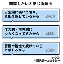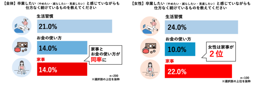 「卒業したいのに仕方なく続けていること」について、「生活習慣(夜ふかし・運動不足)」(21.0%)が最多となりました。続いて、「お金の使い方(ギャンブル・無駄遣いなど)」(14.0%)と「家事」(14.0%)が同率という結果になりました。