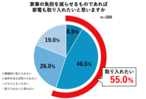 そうした中、「家事の負担を減らせるものであれば、家電も取り入れたいと思うか」という問いに対して、55.0%が「そう思う」と答えており、家事効率化に対する前向きな意識が広がっていることが判明しました。