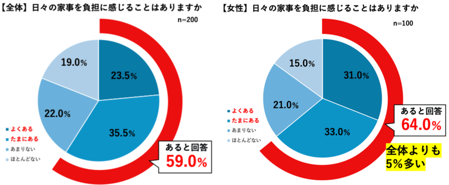 「日々の家事を負担に感じるか」という問いに対し、感じると回答した人は59.0%となり約半数を超える結果となりました。なかでも女性に限ると64.0%となり、全体と比べるとさらに家事の見直しニーズが高いことが明らかになりました。