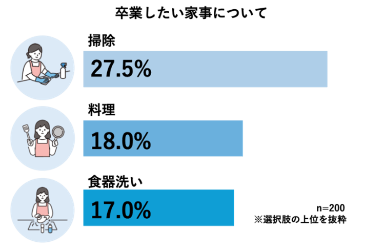 また、卒業したい家事の内訳を見ると、1位は「掃除」(27.5%)、続いて「料理」(18.0%)、「食器洗い」(17.0%)が上位に挙がり、家事の中でも日常的に発生するものほど、卒業したい意識が高くなることがうかがえます。