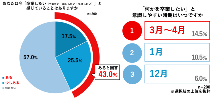 「何かを卒業したい(やめたい・減らしたい・見直したい)」と感じているかを尋ねたところ、43.0%が「卒業したいことがある」と回答。「何かを卒業したい」と感じやすい時期について尋ねたところ、卒業シーズンや新年度の節目にあたる3月~4月が最多の14.5%となりました。