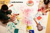 「音筆」は、楽器の音の振動を、インクや絵の具を使って目に見える模様として描く特別イベントです。プロの演奏家としても活動するスタッフと一緒に、実際に楽器の音を鳴らしながら、大きな紙に制作を行います。 使用する楽器は、和太鼓やシンバル、ドラム、バイオリンなどさまざま。音の大きさや響きによって変化する模様を楽しみながら、音を“聴く”だけでなく“見る”体験ができます。