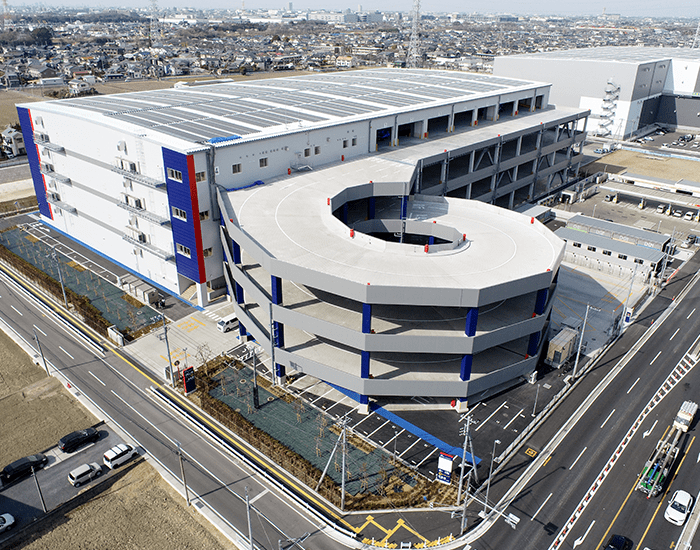 建物は、延床面積45,218.02㎡、鉄骨造4階建てで、各階に直接アクセスできるランプウェイ方式を採用しています。1フロアにつき19台の大型車(10t車)が同時に接車できるトラックバース※1を備え、効率的かつ柔軟な物流オペレーションを可能にします。また、入居テナント企業は約2,700坪の1フロアを専有でき、最大4テナントの入居が可能なマルチテナント仕様です。倉庫内には空調設備を導入し、さらに各階には専用のカフェラウンジを設置することで、従業員が快適に働ける職場環境を整備しました。