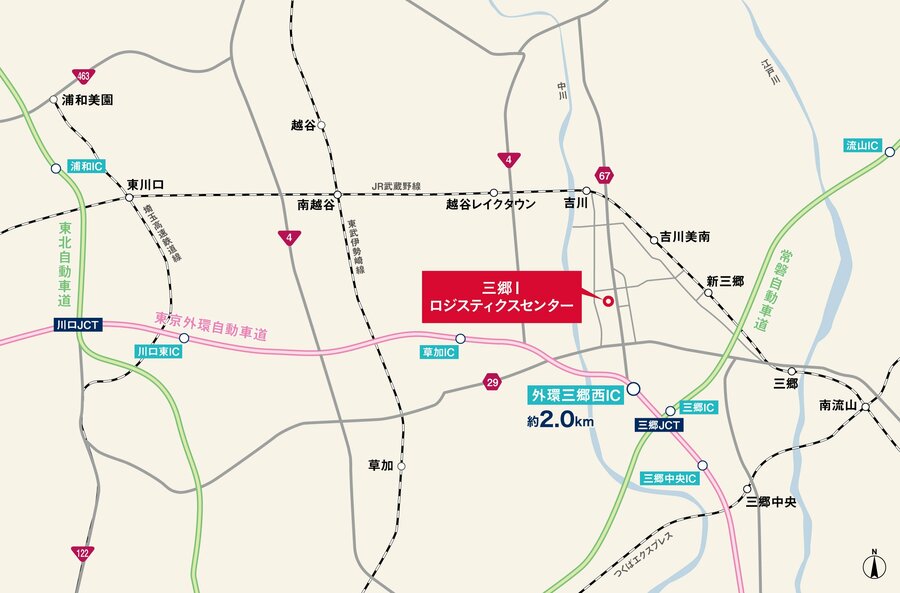 「三郷Ⅰロジスティクスセンター」は、関東近郊をつなぐ外環道と都心をつなぐ常磐自動車道の結節点である三郷エリアに位置し、外環道「外環三郷西(IC)」から約2kmと、交通アクセスに優れた立地です。東京都心へは1時間以内で配送可能なほか、都内のみならず首都圏全域への広域配送拠点として適しています。