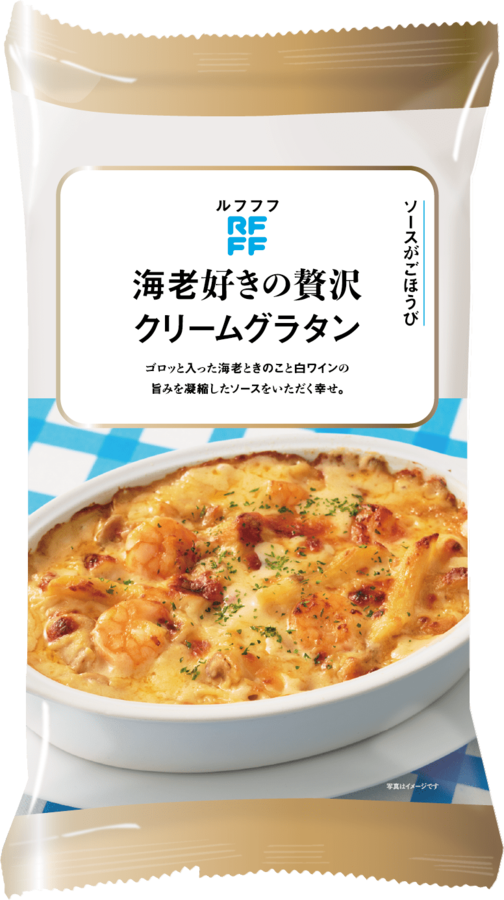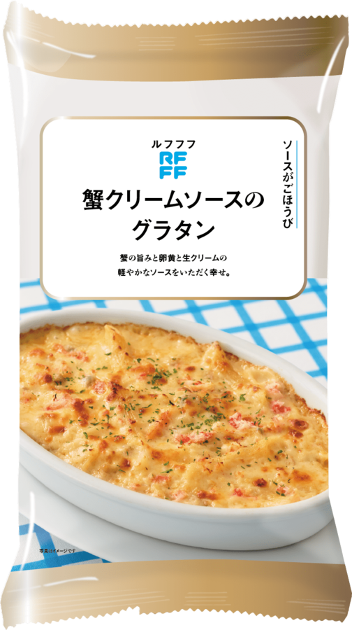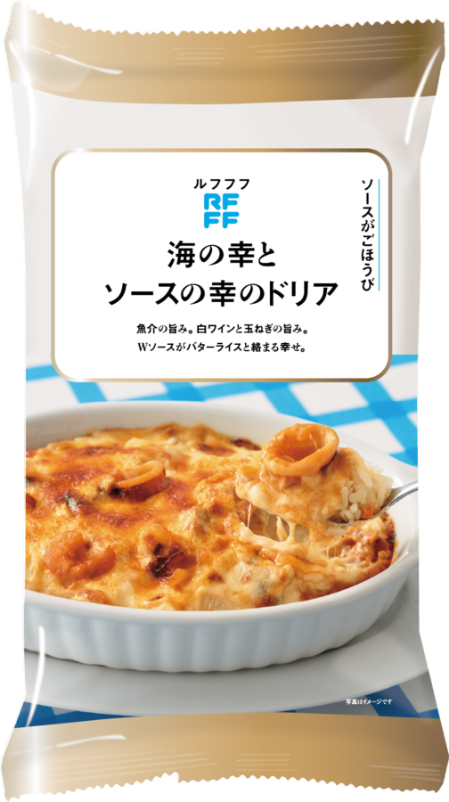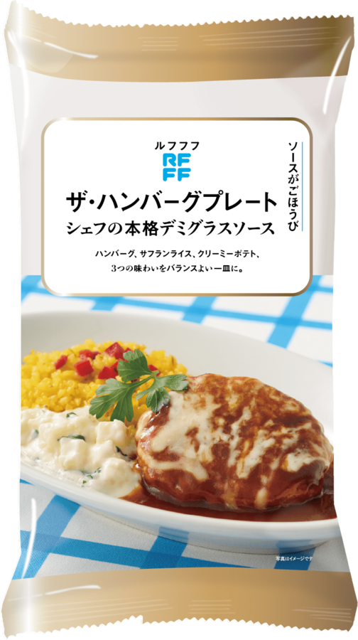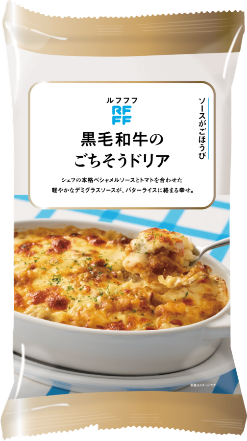またパッケージも「洋食レストランのテーブル」を想起させるデザインへ一新。ブルーのテーブルクロスや金の色使いなどで、「RFFF」の世界観と、手間ひまをかけた料理のおいしさを表現しています。