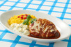 お肉の旨みがあふれるハンバーグに、コク深いデミグラスソースがたっぷり。香り豊かなサフランライス、クリーミーなポテト、ハンバーグの3種類の料理を一緒に楽しめます。それぞれの料理の味わいはもちろん、ソースが他の料理と混ざり合って、一口ごとに食べ飽きない美味しさです。