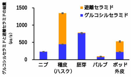 図2. カカオの各部位に含まれるグルコシルセラミドおよび遊離セラミドの総含有量※5