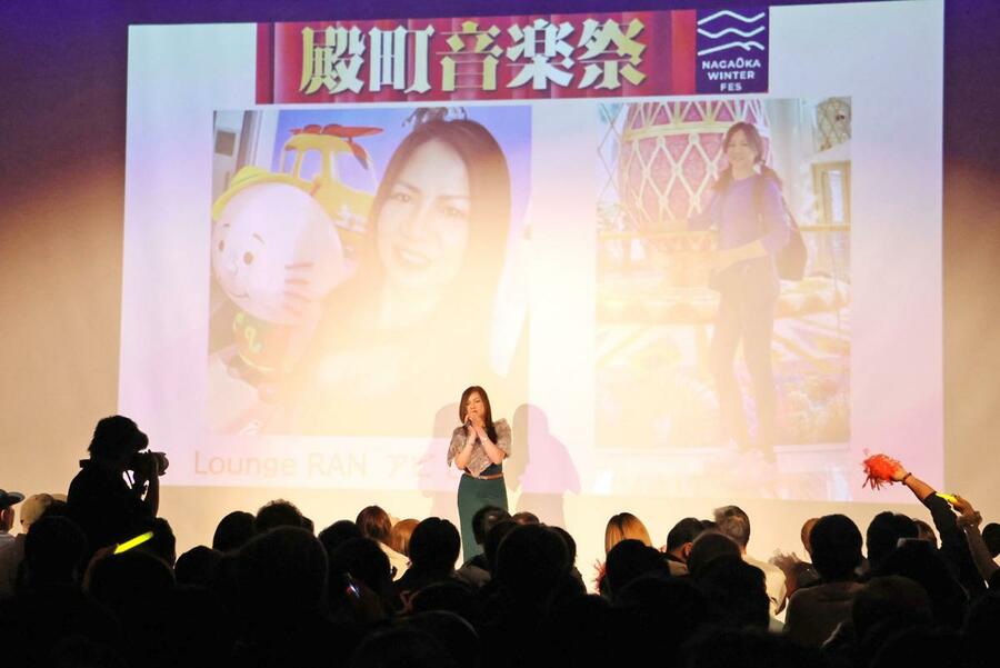 長岡市中心部のスナックなどに勤める女性が歌声を競う「殿町音楽祭」が、アオーレ長岡で開かれた。会場は満席で、観客は歌に合わせて手づくりのうちわを振ったり、指笛を吹いたりして応援し、熱気に包まれた。