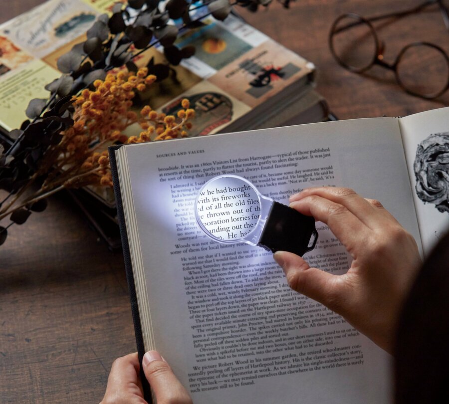 『電球ルーペ』は、電球をモチーフにしたユニークなフォルムで、LEDライト付き薄型ルーペです。手のひらサイズでコンパクトながら、直径45mmのアクリルレンズを採用。新聞や辞書、商品の成分表、注意書きなど、日常生活で目にする細かな文字を快適に読むための補助ツールとして最適です。