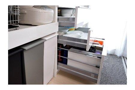 ・ 耐震ラッチや飛散防止フィルム、ソフトクローズ機能などによる収納物の飛散防止