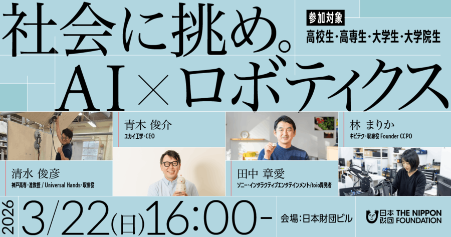 3月22日(日)に開催される第8回では、いま、多岐にわたる社会課題を解決する1つの「カギ」として期待を集める「AI×ロボティクス」をテーマに、日本、そして世界が直面するさまざまな社会課題に対し、AIやロボット技術がどのように活かされているのか、現場で挑戦を続けるエンジニア・研究者・起業家をゲストに迎え、先端テクノロジーが未来社会にもたらす可能性をともに考えます。